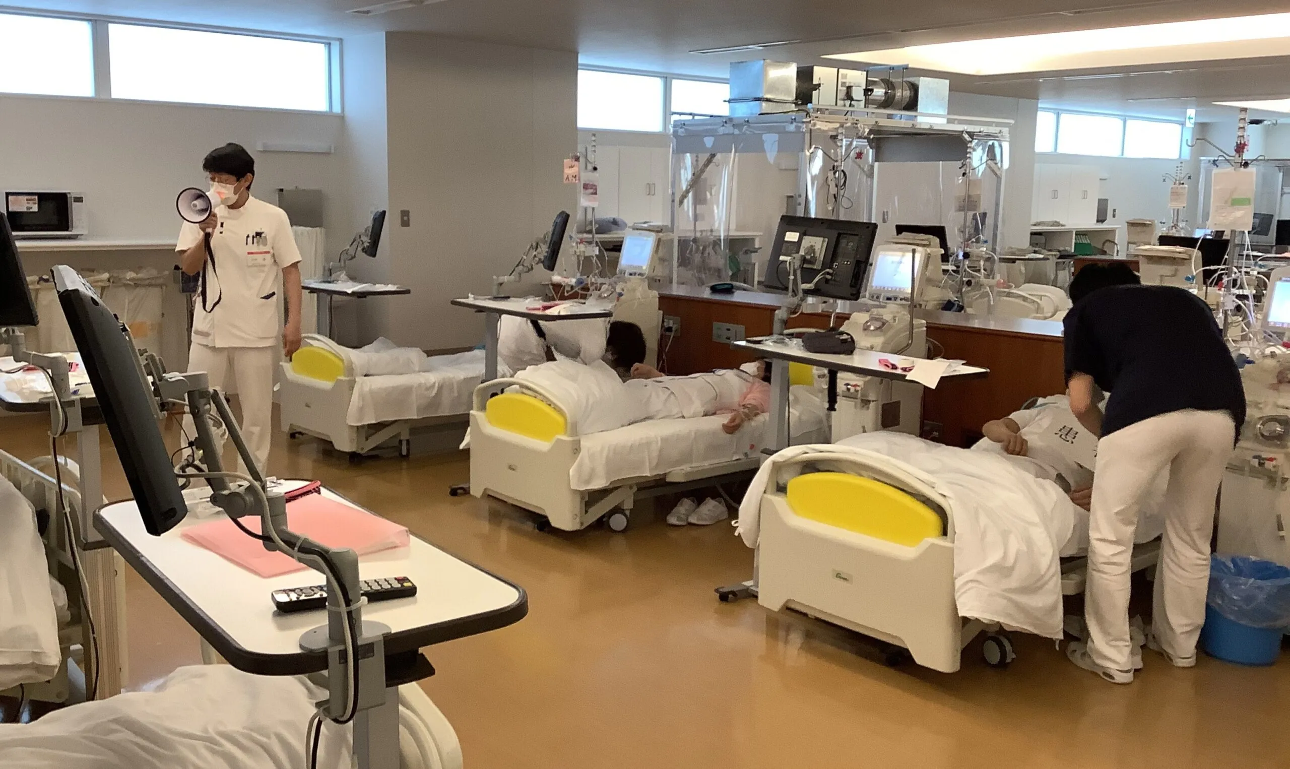 今回は、透析中に別フロアーにて火災が発生したという設定で行い、